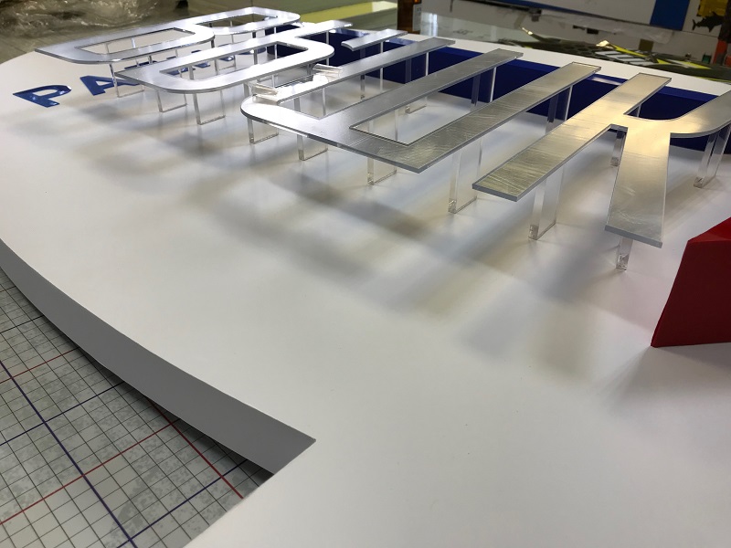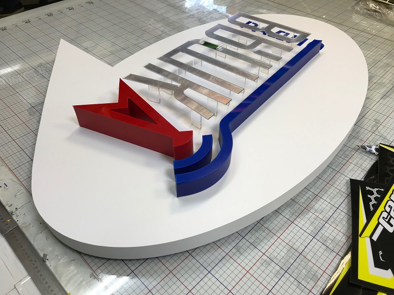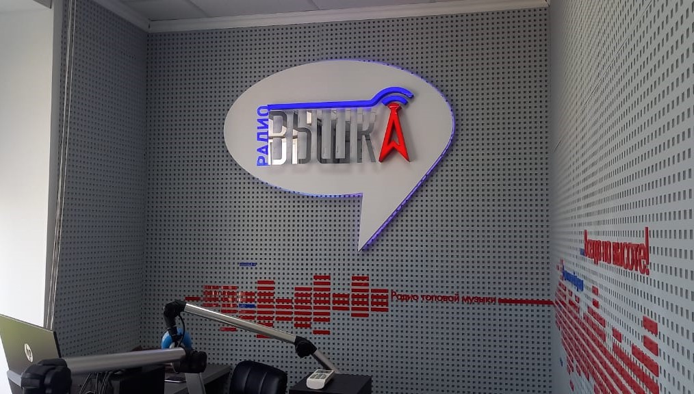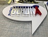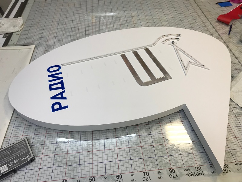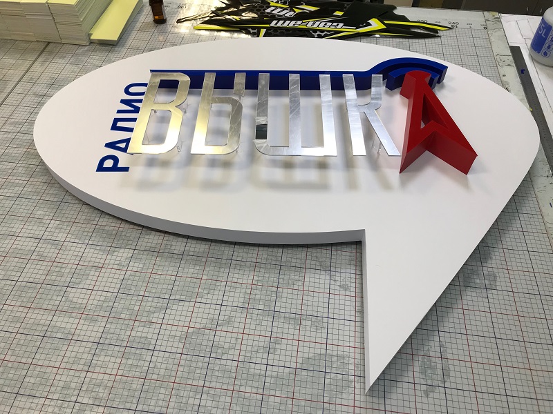 Световая вывеска. Вывеска изготовлена из: пластик пвх, пленка оракал, зеркальное оргстекло серебро, акрил красный, синий, светодиодные ленты. RGB пульт управления. По контуру многоцветная лента rgb.