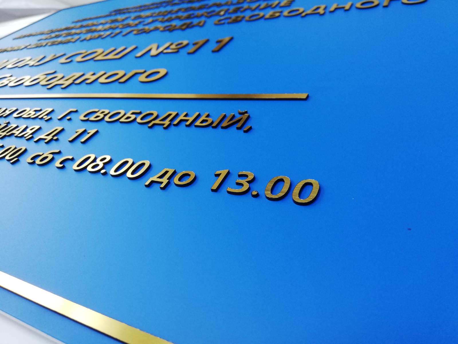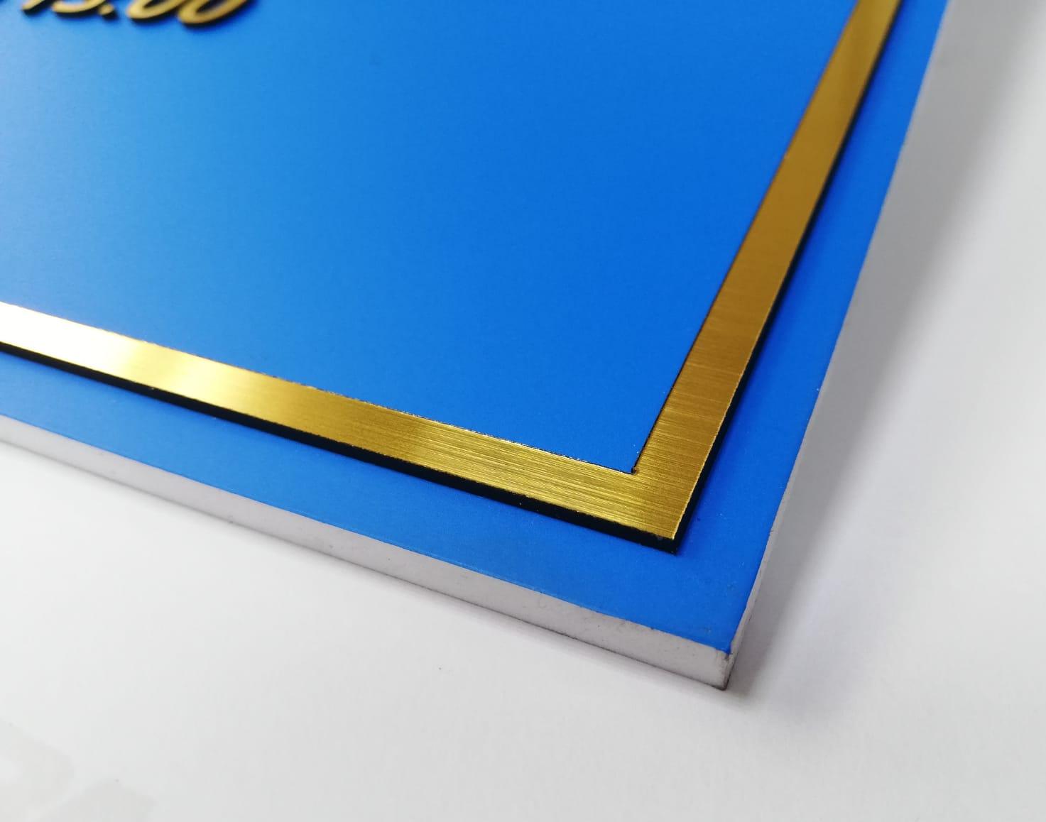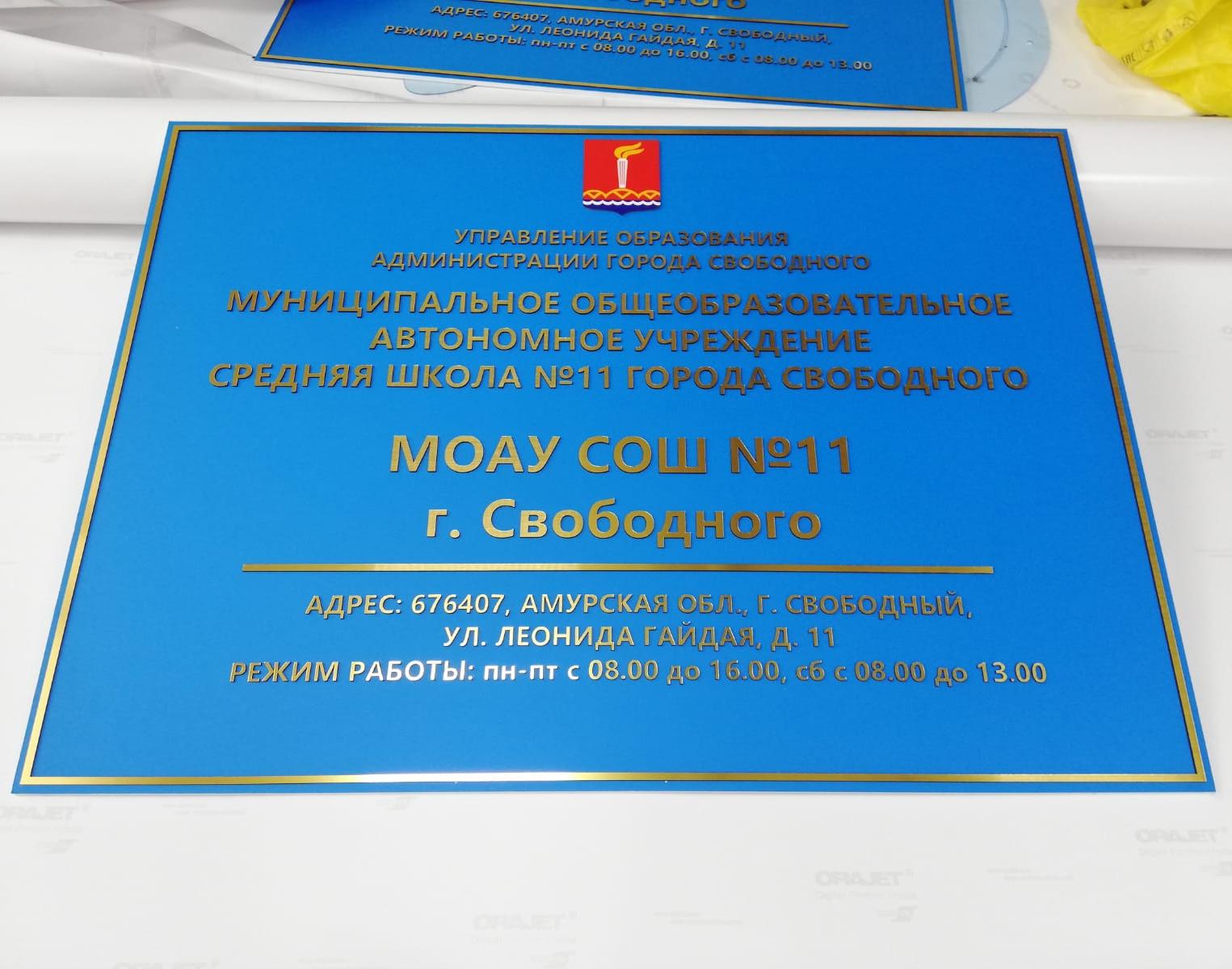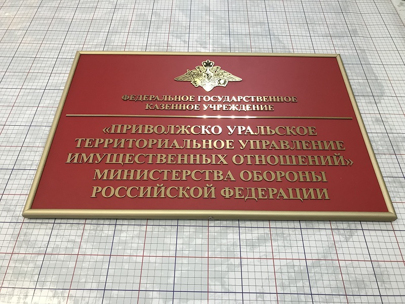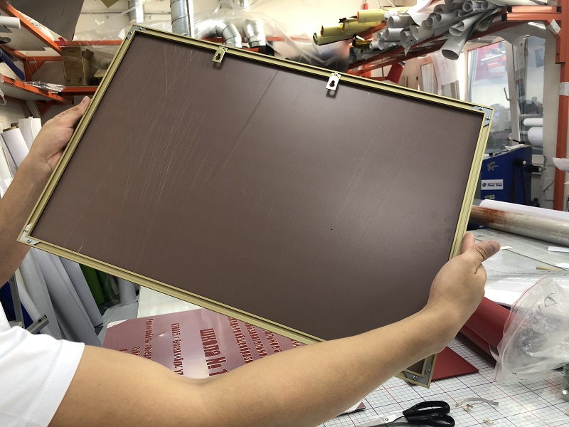 Табличка имеет основу алюминиевый композит, поверх нанесены зеркальные буквы с защитной пленкой, по периметру установлена алюминиевая рамка нельсон. На задней стороне имеются крючки.
