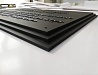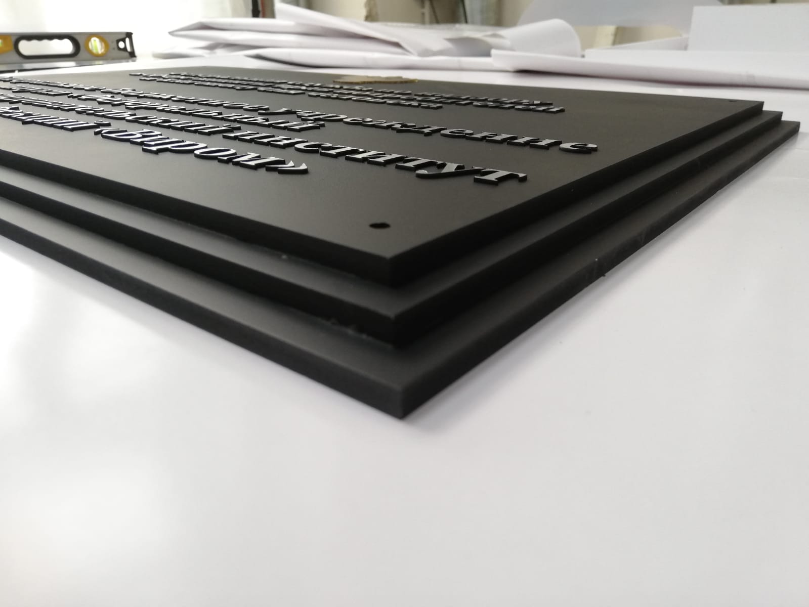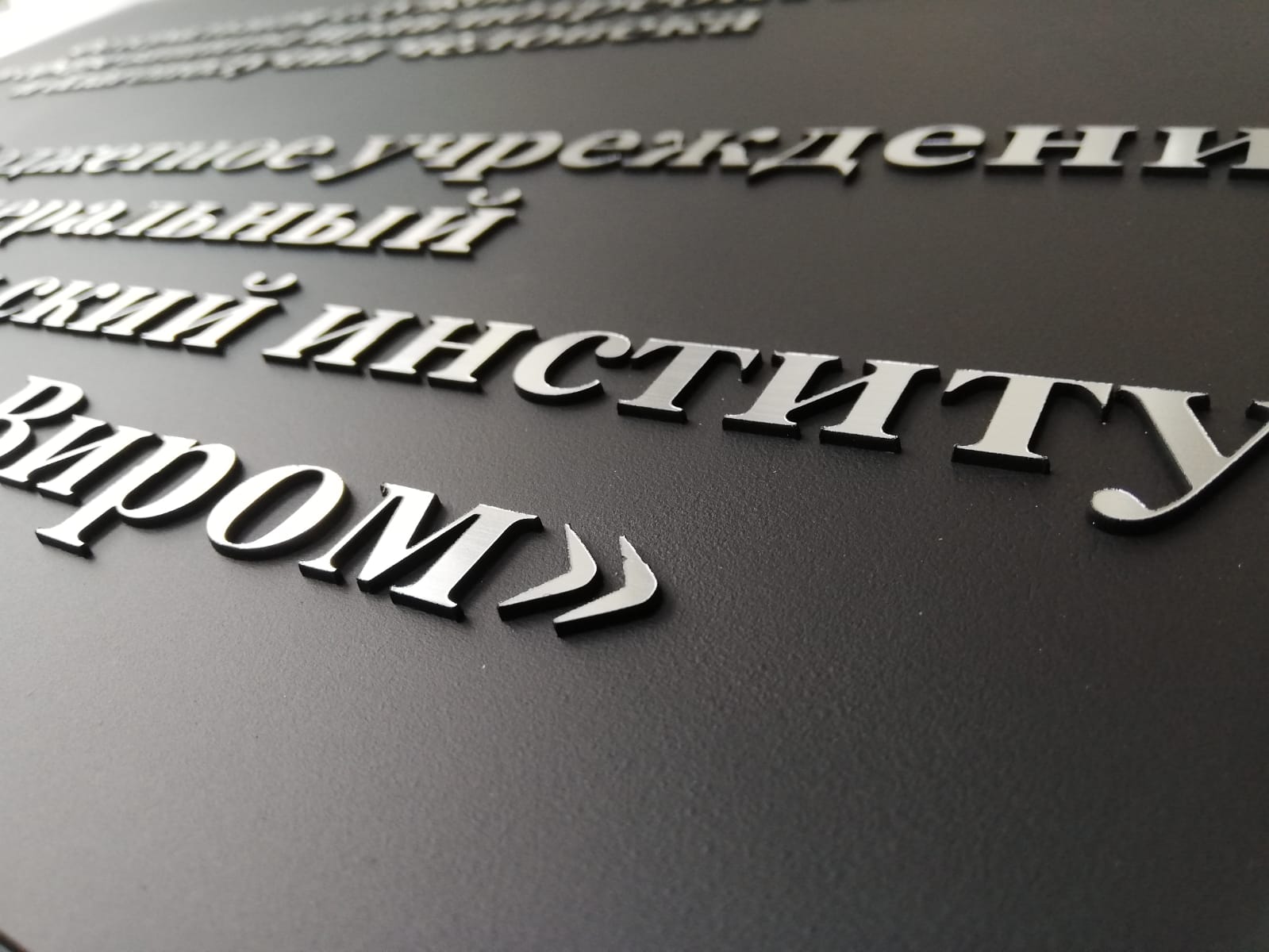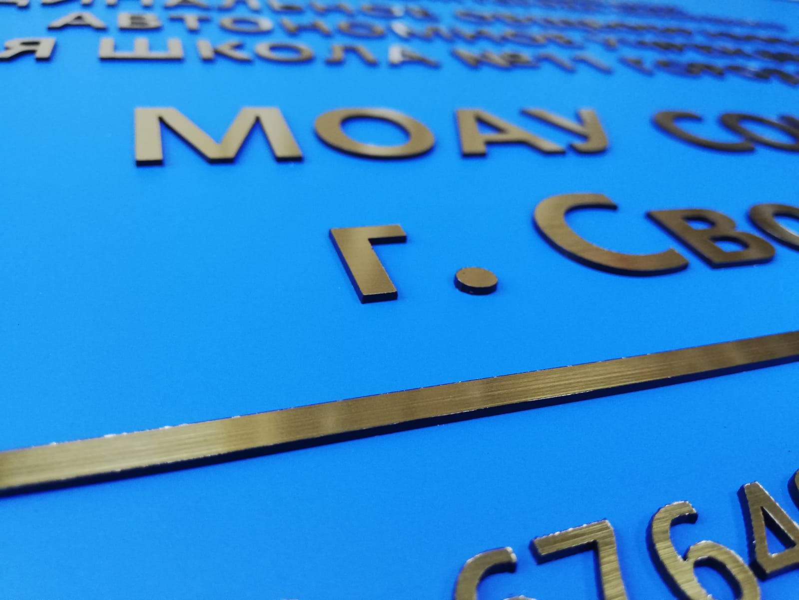 Табличка имеет основу алюминиевый композит, поверх нанесены зеркальные буквы с защитной пленкой, по периметру установлена алюминиевая рамка нельсон. На задней стороне имеются крючки.