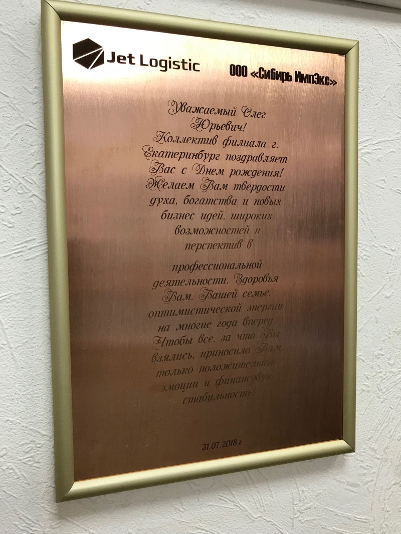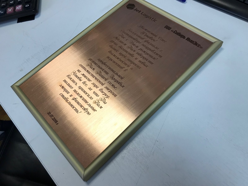 Даже не сомневайтесь, медную табличку с гравировкой от «Print Ural", обязательно оценят все клиенты.